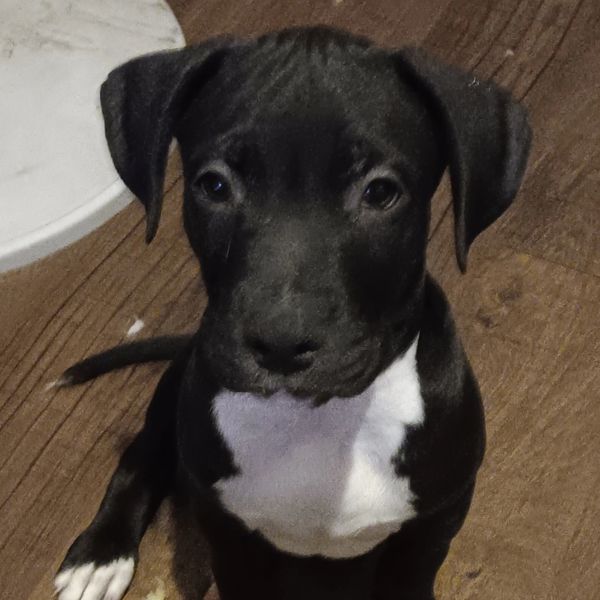 He has a HUGE black heart that is on his side. He is going to be a big guy as well. He absolutely loves to rough house, play along with his siblings, and eat all that he can. He is such a lover, hence the name Hearty. He's a handsome guy that just wants to be next to someone constantly. He knows the command 'sit', and he loves playing with big dogs, cats, and any animals